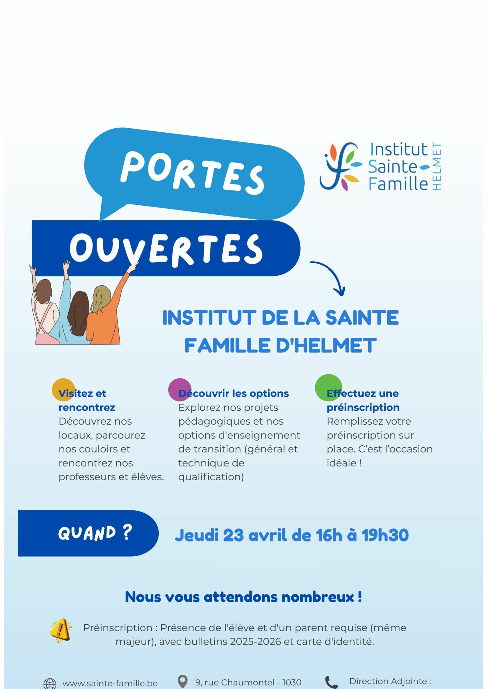 🟣 Journée Portes Ouvertes à l’Institut de la Sainte-Famille d’Helmet Secondaire📅 Le samedi 12 avril 2025🕙 De 10h à 13h📍 ISF Helmet – Rue Chaumontel 9, 1030 Schaerbeek Chers parents, …